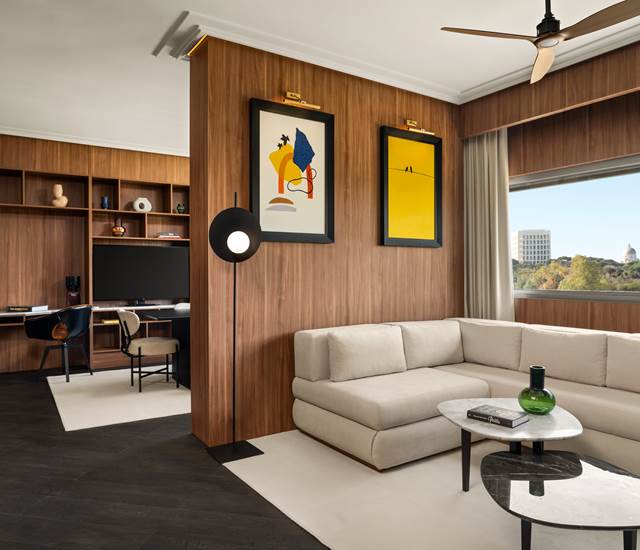 Our BIG Suites span 115 square metres and include a sleeping area equipped with a king size bed, a roomy bathtub, a handy kitchenette, a walk-in wardrobe, a large living and dining room, and even a professional office. Soak up the Italian sun out on your spacious terrace, or curl up with a great book from your private library. Our BIG Suites have the best views of the entire hotel, since you’re looking out over the garden, the outdoor pool and the Colosseo Quadrato. Molto impressionante!